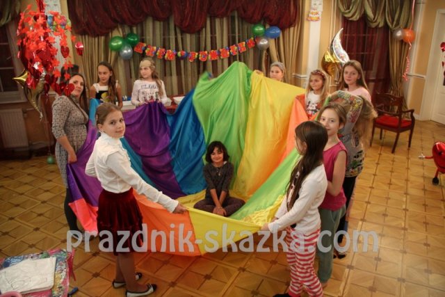 У отличных специалистов всегда есть яркий реквизит – семиметровый тоннель по которому нужно проползти на время, удивляющий разноцветный цветок – парашют, игровой элемент «плетение косички» - командное соревнование, шляпы, твистинг – воздушные шары и конечно же аквагрим – роспись на лице.